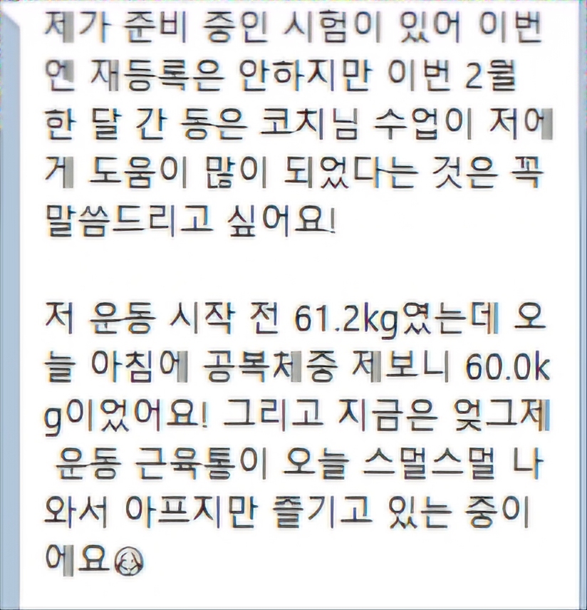 수업이 종료된 후, 루틴을 공유드립니다. 개선사항도 간단히 정리드리며, 도움이 되는 운동은 영상으로도 공유드리고 있습니다. 개인톡으로 편히 소통하고 있어요 :)