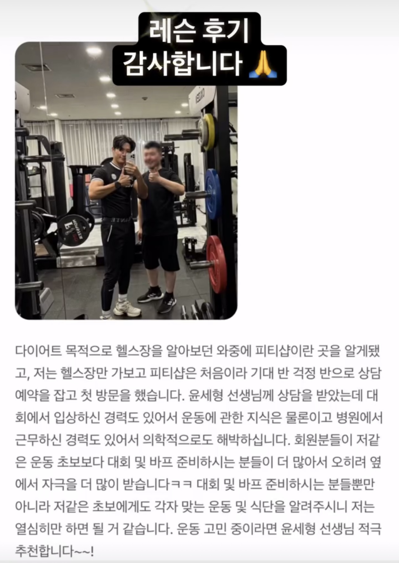 • 회원님들과의 소통을 중요시하며, 네이버 밴드 등을 활용해 운동 영상 공유와 일지 작성법을 지도하여 목표 달성을 위한 체계적인 환경을 제공합니다.