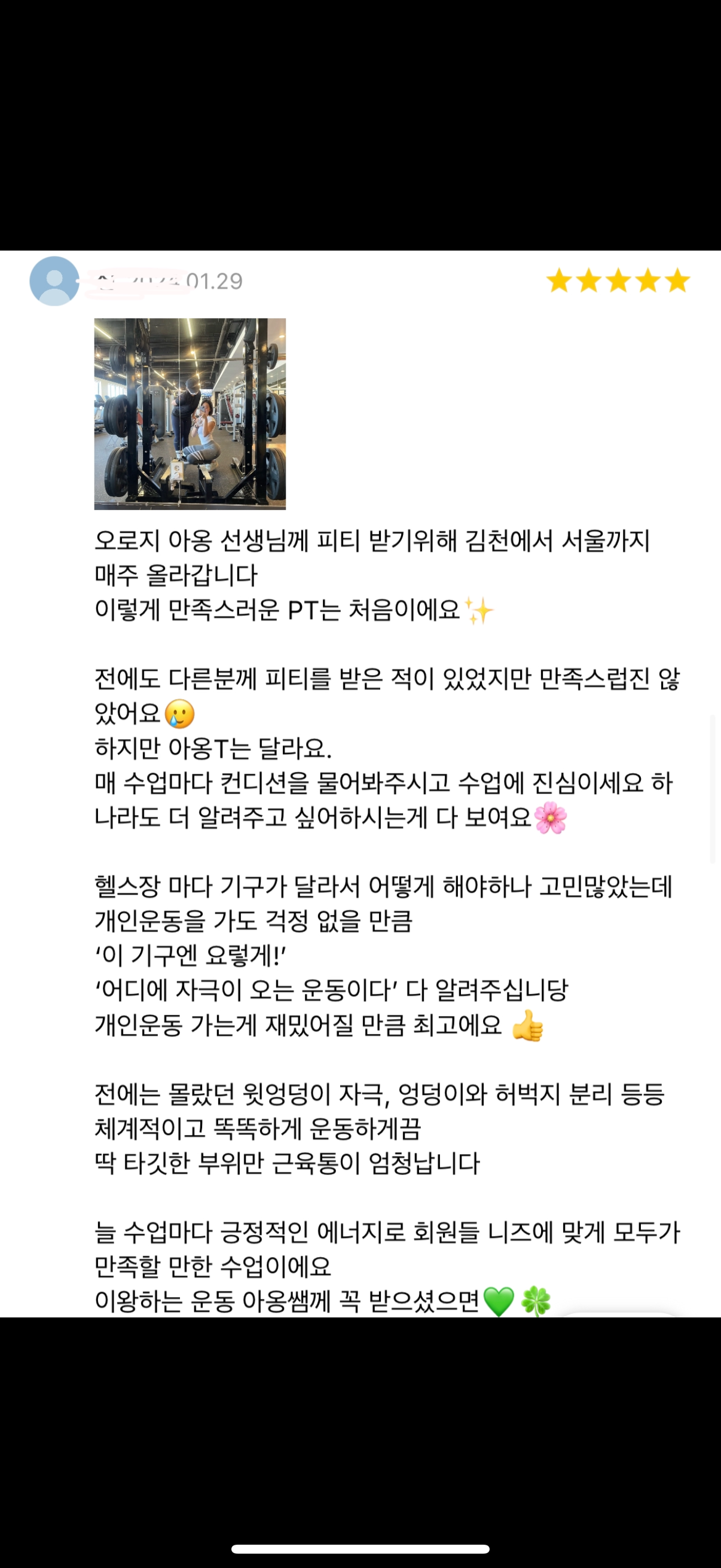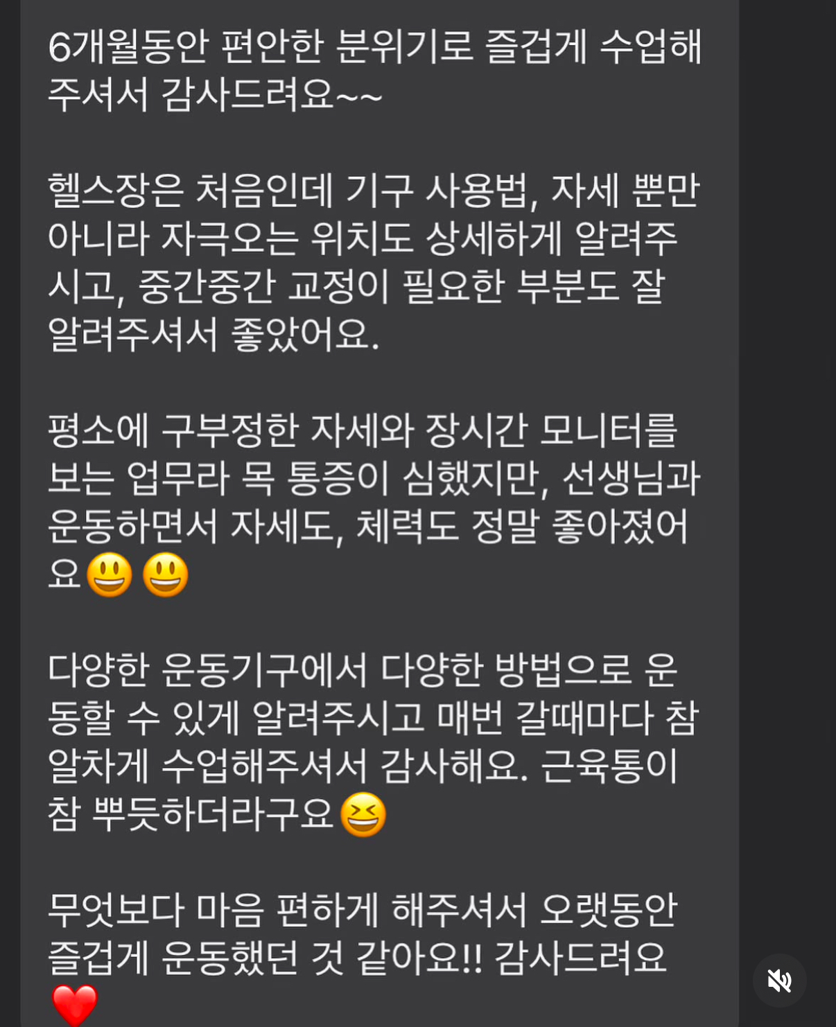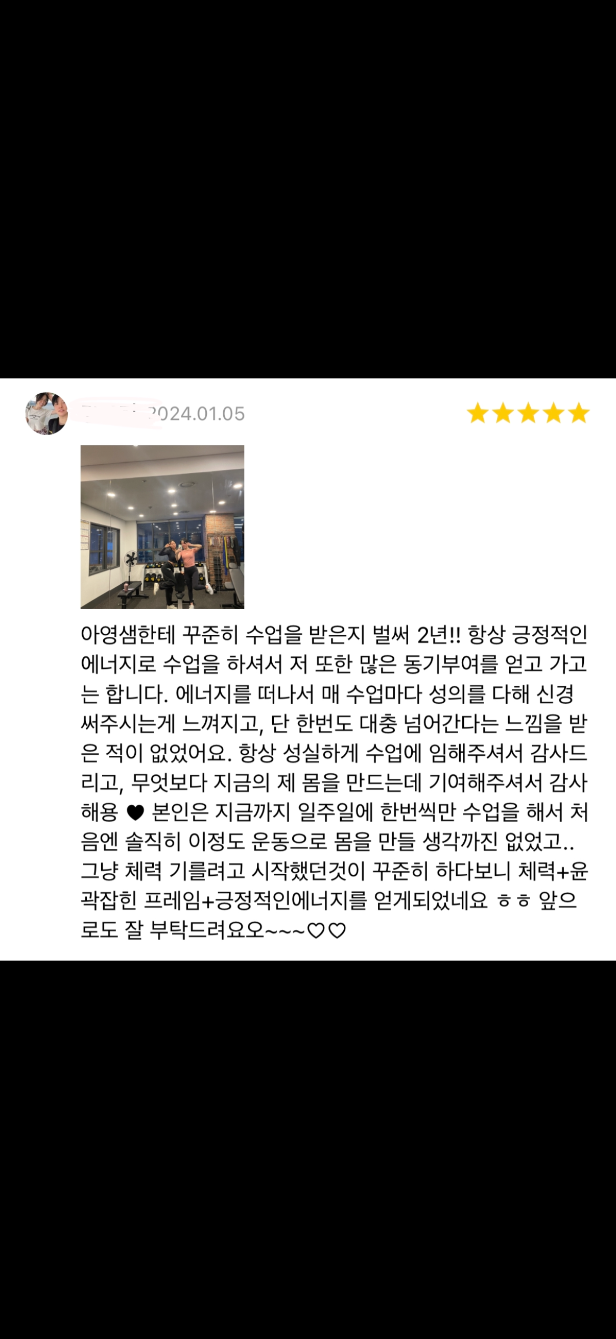 운동에 대한 거부감이 먼저 없고 재미있어야 꾸준히 하게 됩니다 그 부분은 저랑 수업을 하면서 직접 몸이 펴지고 재미있는 것을 느끼게 해드리겠습니다