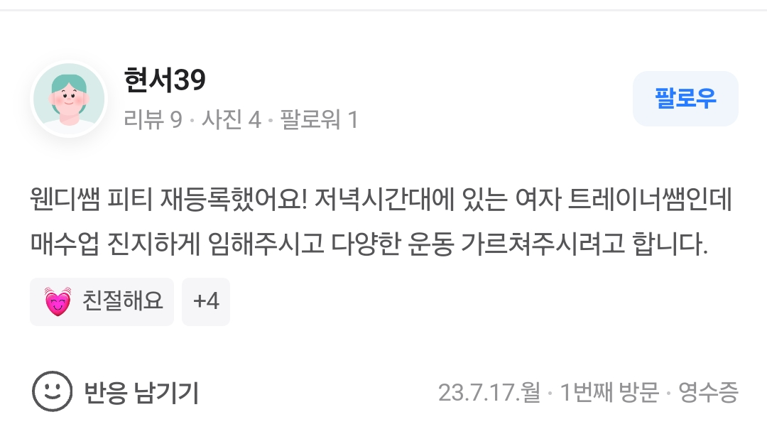 회원님들은 저의 이런 일관적인 텐션에서 편안함을 많이 느끼시기 때문에 저랑 운동하는 시간에 빨리 익숙해지신다고 하십니다.