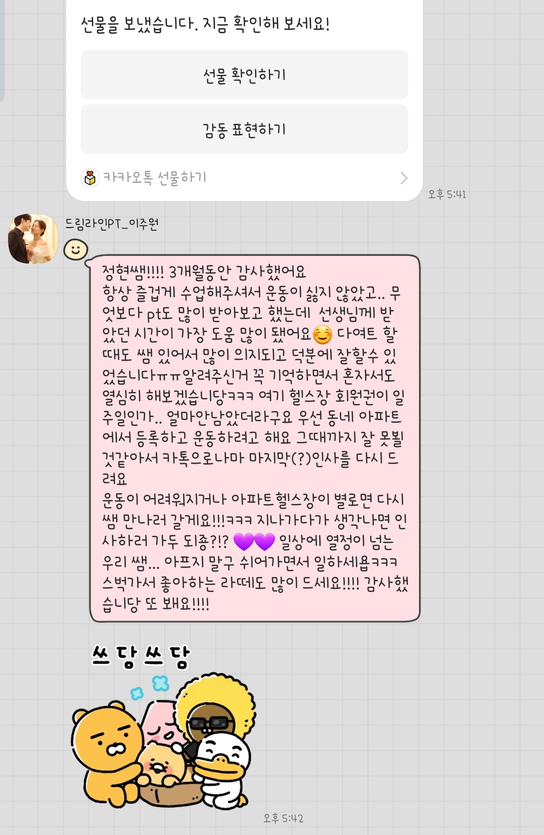또 PT 수업 후엔 , 혼자 운동이 가능하실 수 있게 수업 내용을 정리해서 보내드립니다.