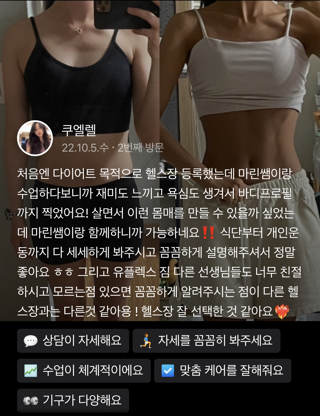 저는 전 연령대, 다양한 목적을 가진 회원님들과 함께해온 실전 경험을 갖추고 있습니다.