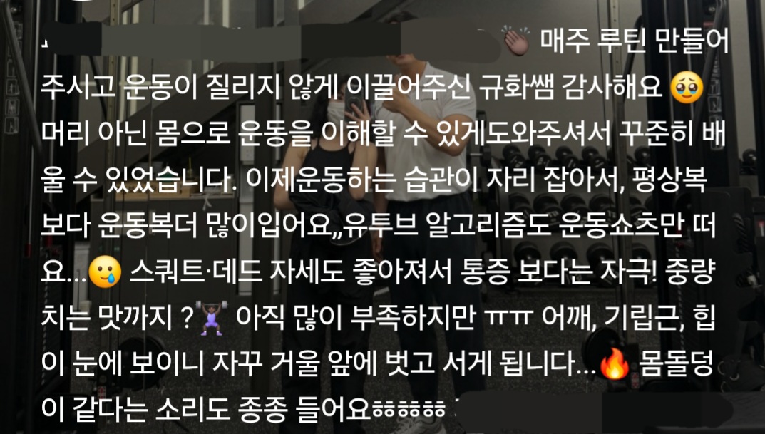 2. 개인 운동일지를 만들어 구체적인 부위 및 운동법을 체크하고 당일 피드백을 써서 수업당일 바로 전송 ➡️운동일지를 통해 스스로 보완과 연습 가능