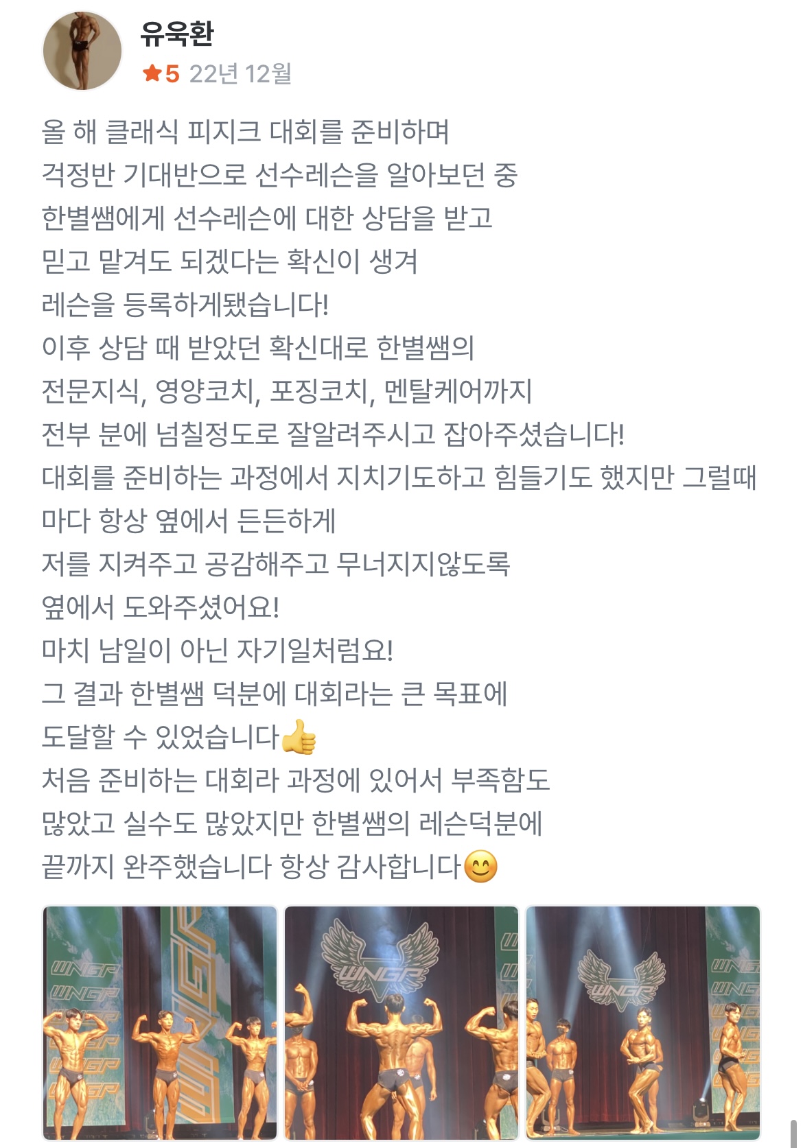 약 12년여간 트레이너를 하며 다이어트, 벌크업, 체형교정, 재활운동, 바디프로필, 대회참가, 엘리트체육코치 등 수많은 목적의 회원님들을 현장에서 지도하고 경험하였습니다.