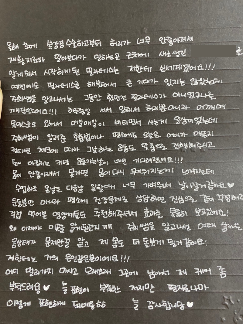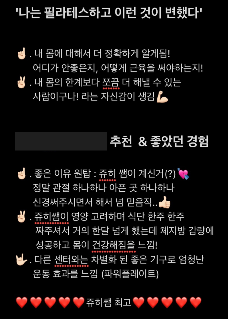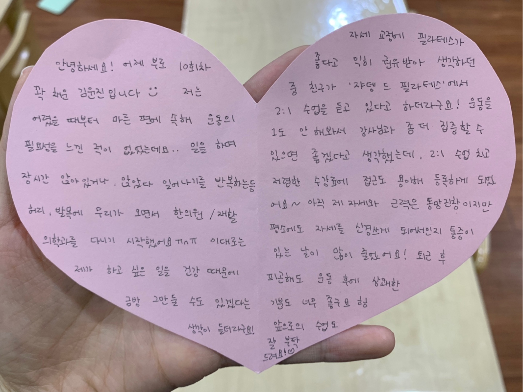저는 필라테스를 고등학교때부터 쭉 해와서 저에게는 너무나 익숙한 운동이기도 합니다. 이 익숙한 운동을 운동을 좋아하지 않는 사람들, 또는 어려운 사람들에게 재미있게 가르치는게 제 첫번째 목표였고 지금도 그렇습니다.