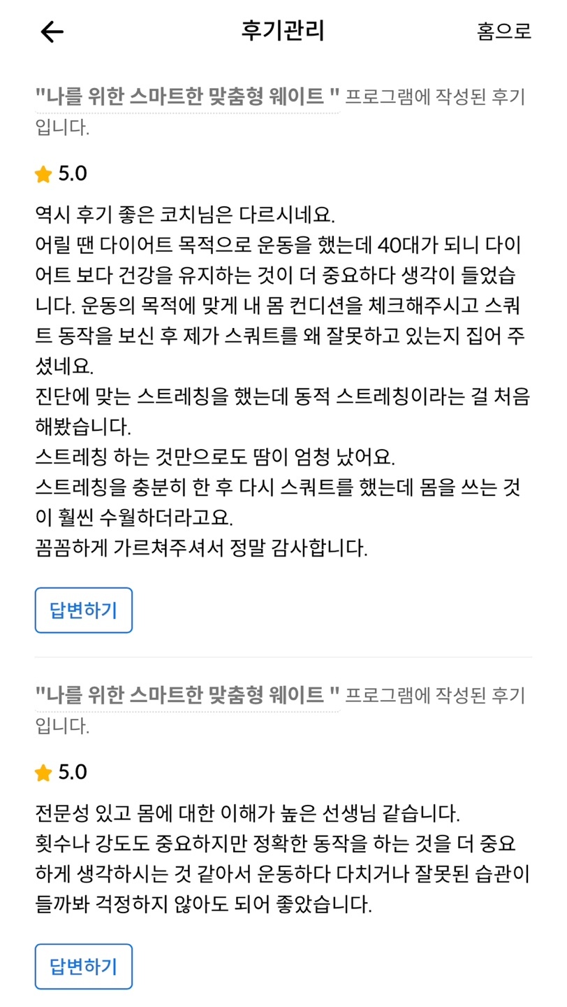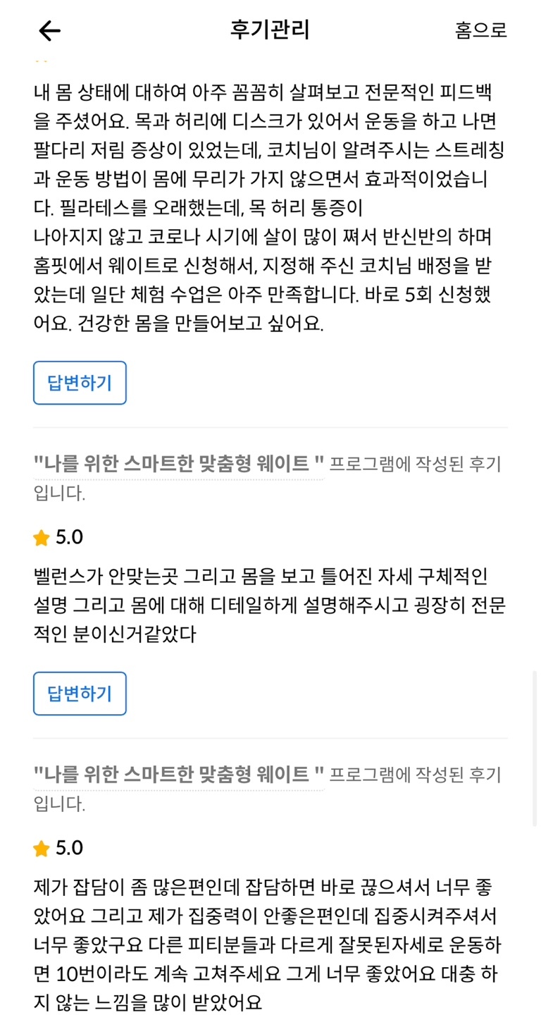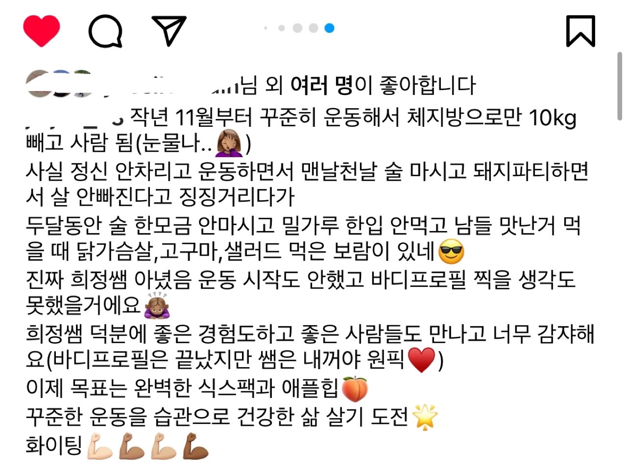 회원님께서 쏟은 노력과 시간을 결코 배신하지 않게끔, 좋은 결과가 함께할 수 있도록 옆에서 물심양면 서포트하겠습니다. 오랜 경험과 경력이 많은 저도 어떠한 부분에서는 부족함을 느낍니다. 모르는 것이 있다면 부끄러워 하지 않고 여전히 공부하고 교육을 들으면서 배우고 적용시키며 보완하는게 좋은 지도자라고 생각합니다.