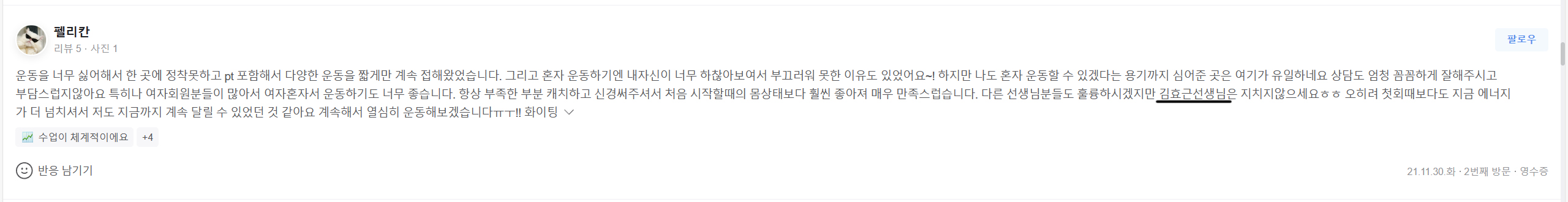 제가 그 무엇보다 좋아하는 운동을 알려주고, 그것으로 인해서 긍정적으로 변화하는 한 사람을 보는 것은 너무나도 행복하고 즐거운 일이었기 때문에 직업으로 트레이너를 선택하게 되었습니다.