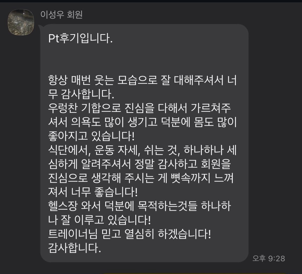 저와 수업한 후에는 헬스장이 친근한 공간이 될 수 있도록 만들어드리겠습니다.