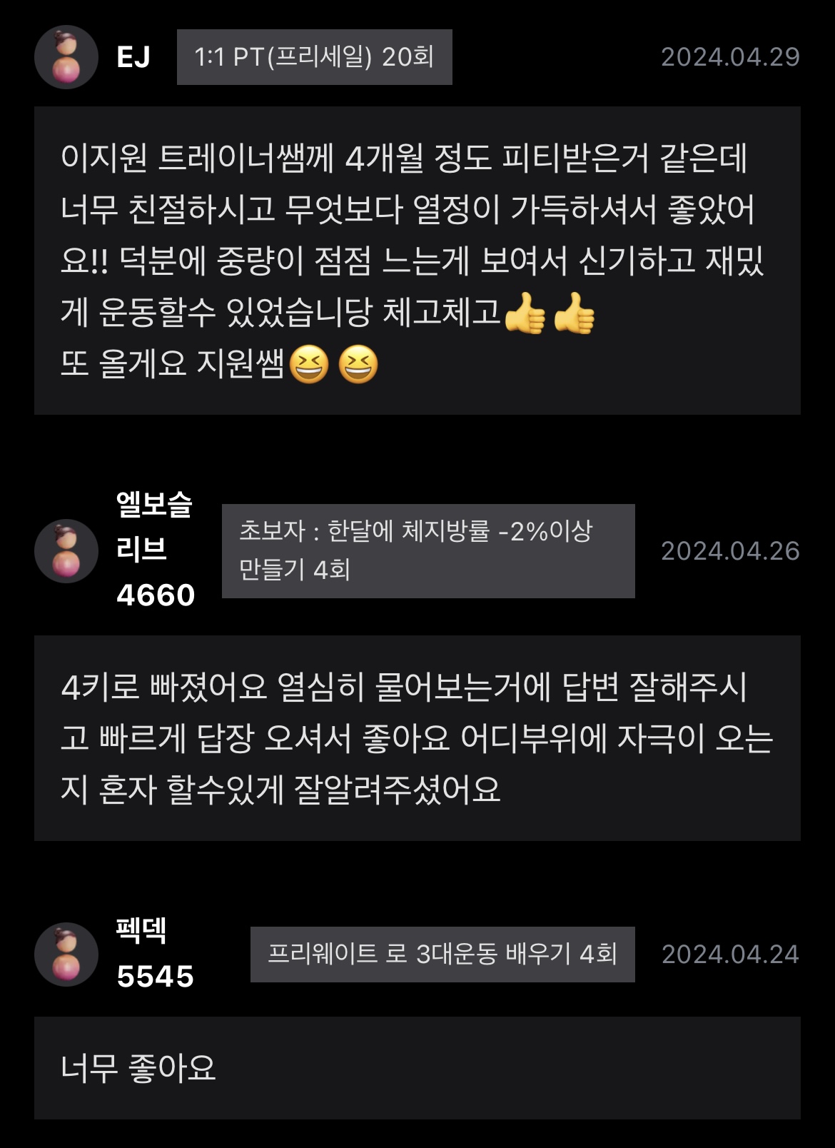 트레이너로 전직을 하면서 500건 이상의 PT후기를 쌓아왔으며 앞으로도 꾸준히 고객을 위한 트레이닝을 제공하고자 합니다.