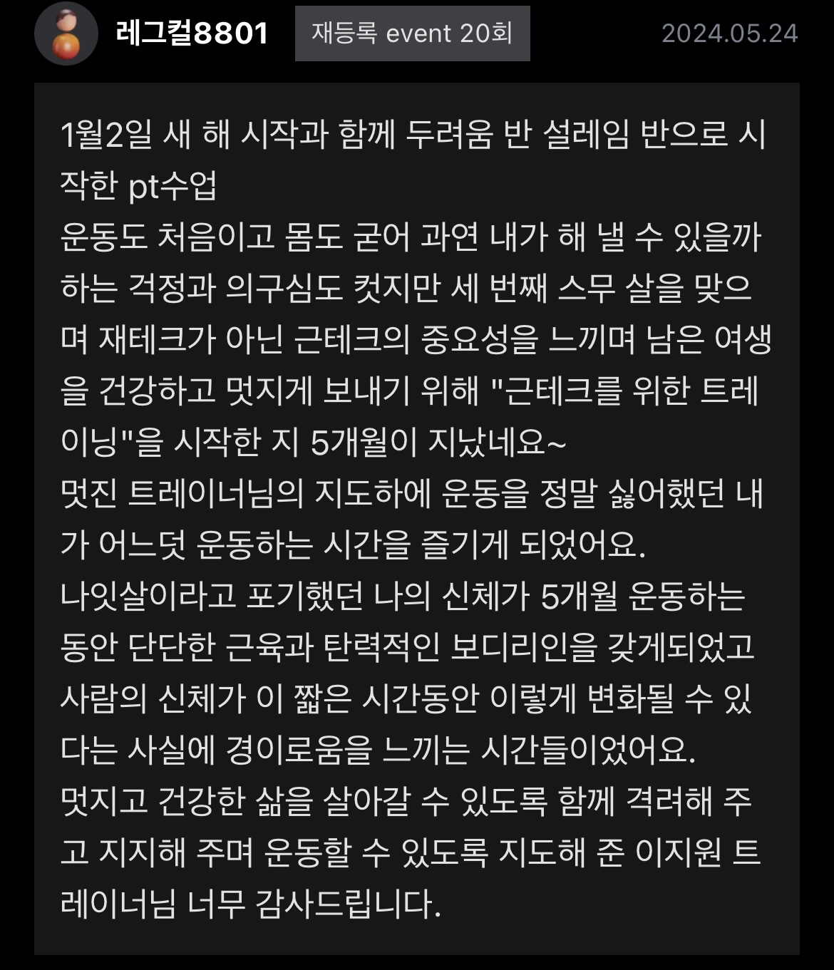 3️⃣재등록 회원 특별 서비스 제공 해드리고 피티후기 확인 가능합니다. (블로그 참조)